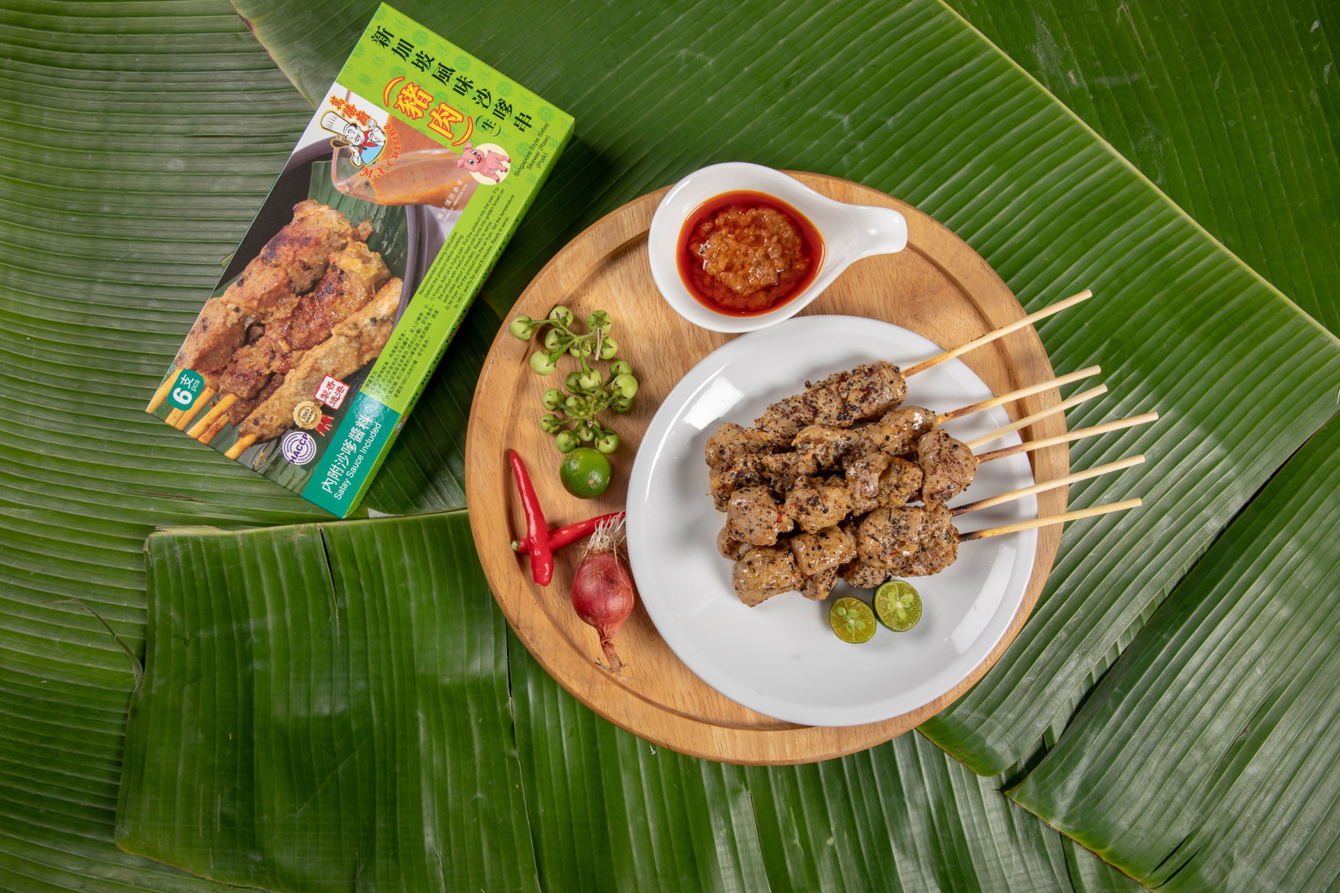 [成份]:豬肉,沙嗲醃肉汁(蒜、大豆油、乾蔥、辣椒、醬、香茅、砂糖、香料粉、食鹽)、砂糖、魚露、豉油、大豆油、澱粉、檸檬葉。含大豆、魚類及其製品。 【內含醬料】沙嗲醬 Satay Sauce 成份:水、花生、大豆油、乾蔥、椰漿、椰糖、蒜、香茅、辣椒、食鹽、椰蓉、改性澱粉、穩定劑(E415) 含花生、大豆及其製品。 (生產此產品的廠房亦處理含有麩質、甲殼類動物及其製品。) 香港製造 信心保證