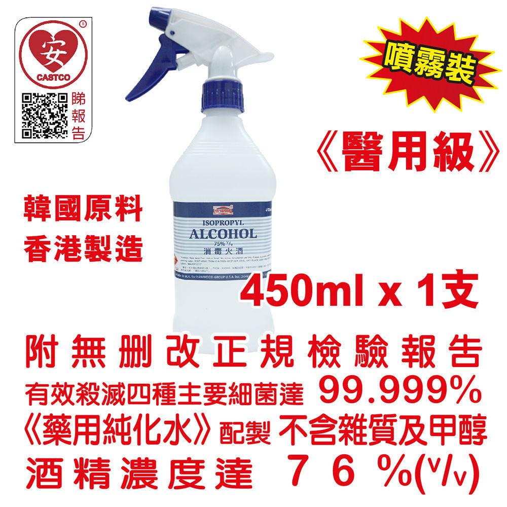 美國康活 - 殺菌消毒酒精 消毒火酒 75% (v/v) 450ml 美國品牌 (醫用級) (1 支裝) 配 多用途噴霧頭 (1 個)