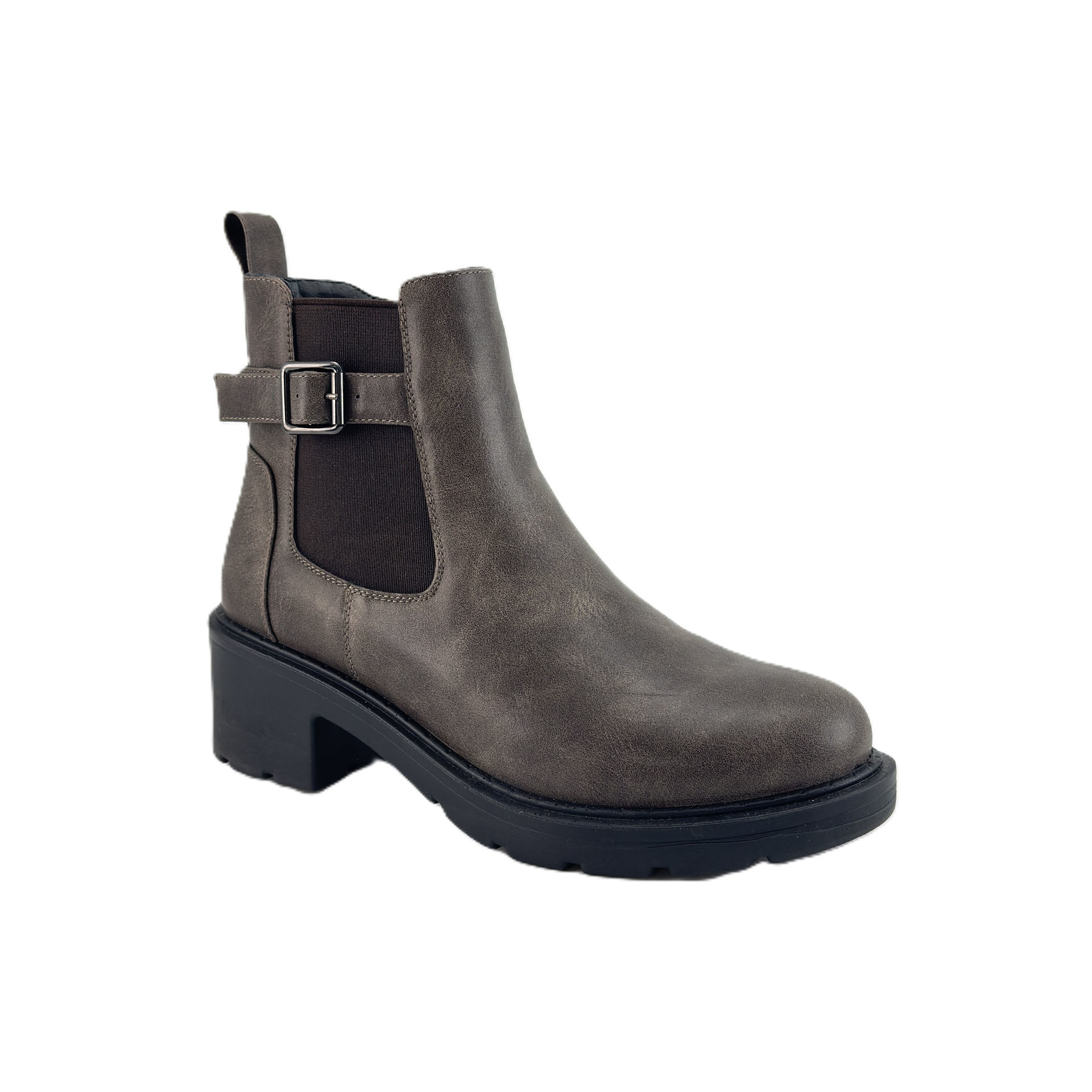 Chelsea boots featuring a stylish block heel and a decorative side buckle, combining classic elegance with modern flair.