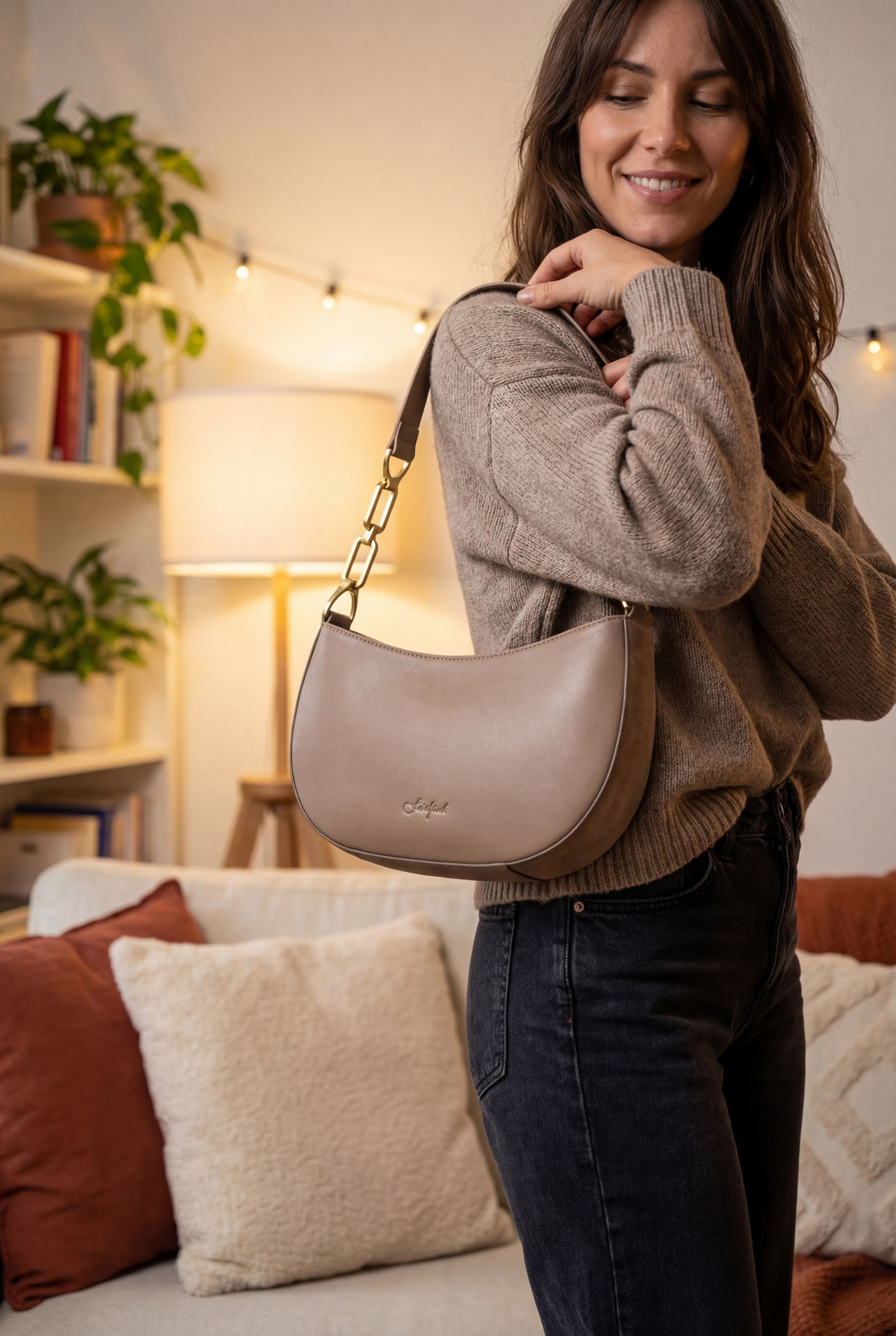 Crafted from smooth faux leather with the Footspot logo embossed on the front, this bag exudes understated elegance. The unique crescent silhouette is paired with a strap that combines leather and gold-toned chain links, striking the perfect balance between style and practicality. With a spacious interior, it makes everyday organization effortless — ideal for casual outings, office looks, or semi-formal occasions.