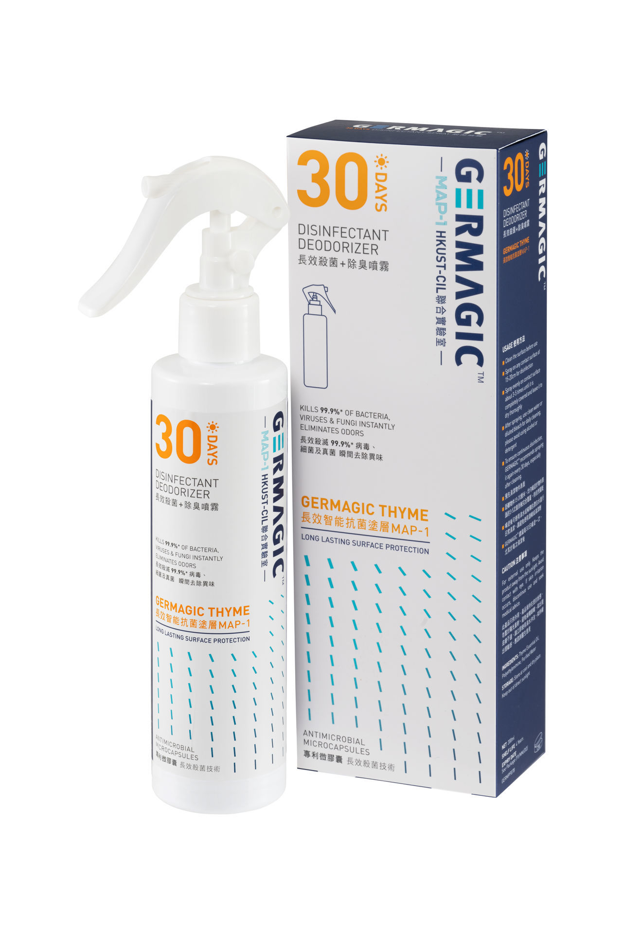 GERMAGIC使用微膠囊技術包裹和延緩釋放殺菌劑, 可以有達致「接觸殺滅」及「釋放殺滅」, 雙重提升防疫效果 , 長達30天持久殺滅99.9%*病毒、細菌及病毒功效。GERMAGIC結合了殺菌膠囊和天然百里香精油,瞬間去除異味,更持久耐用的殺滅效果。