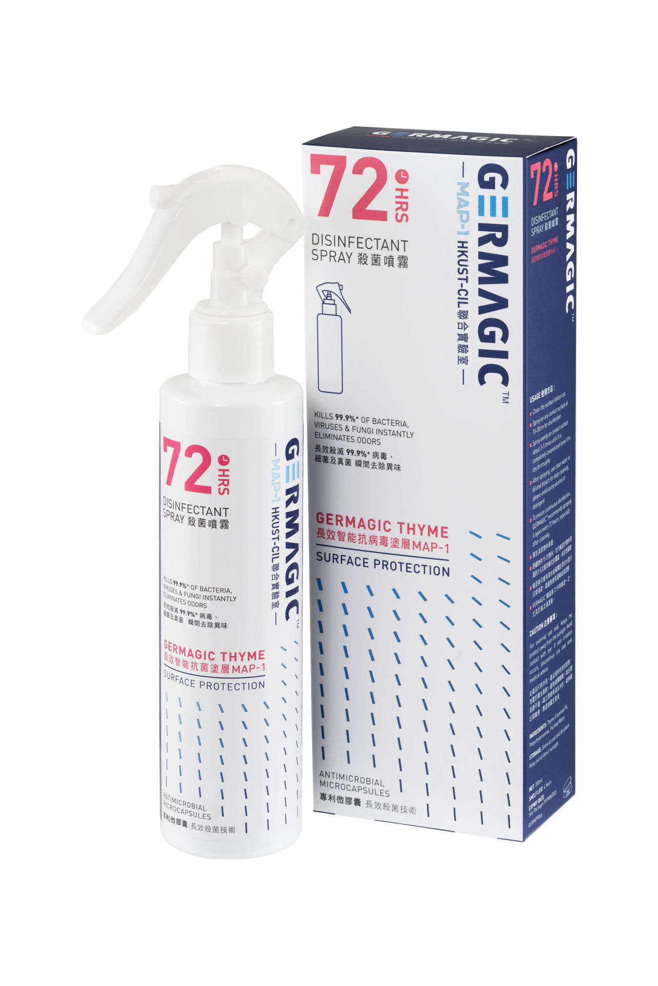 GERMAGIC使用微膠囊技術包裹和延緩釋放殺菌劑, 可以有達致「接觸殺滅」及「釋放殺滅」, 雙重提升防疫效果 , 殺滅細菌及病毒功效, 形成長效72小時防謢