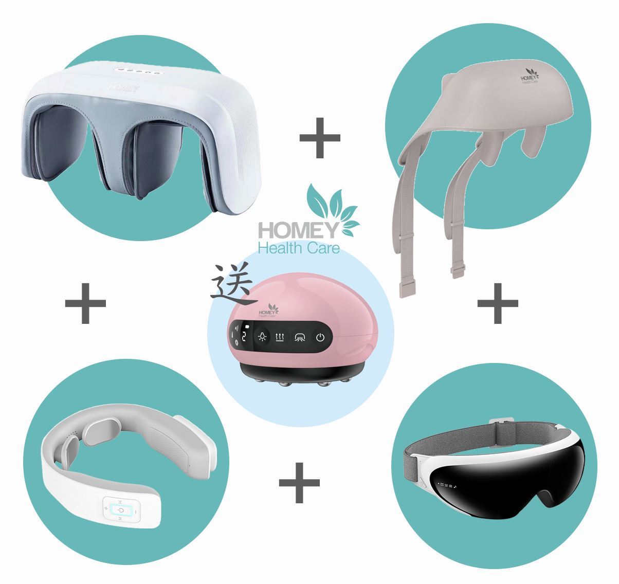 組合包括: iDM-01 Homey Health Care - 腿部按摩器 x1 iBelt-01 Homey Health Care - 全方位健康腰帶 x1 iEye-01 Homey Health Care - 眼部按摩器 x1 iNeck-01 Homey Health Care - 頸部按摩器 x1 贈品: iM-01 Homey Health Care - 多功能迷你按摩器 x1
