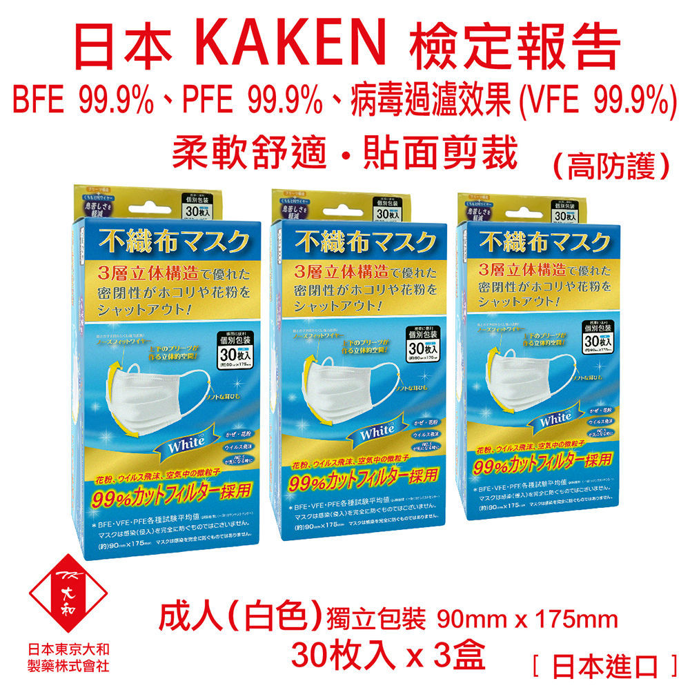日本東京大和 - 口罩 成人 醫用口罩 日本進口 BFE+ PFE + VEF 99.9% 三層立體不織布口罩 (白色)(3盒)(30個/盒)
