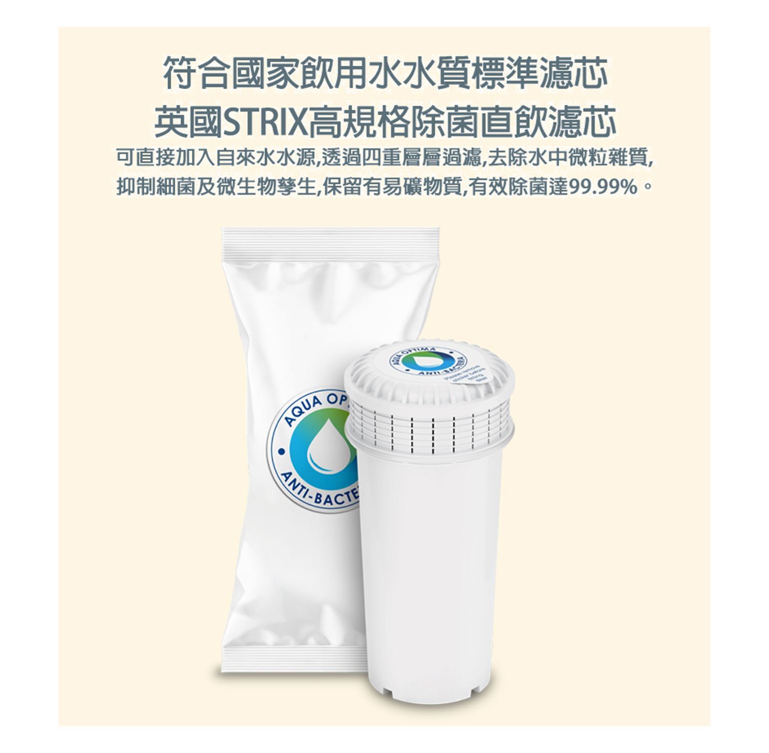 英國STRIX高規格除菌直飲濾芯無須使用飲用水,可直接加入自來水水源通過4重程序層層過濾,去除水中微粒雜質抑制細菌及微生物孳生,保留鈣、鎂、鈉、鉀等有益礦物質餘氯去除率99%SGS認證有效除菌達99.99%