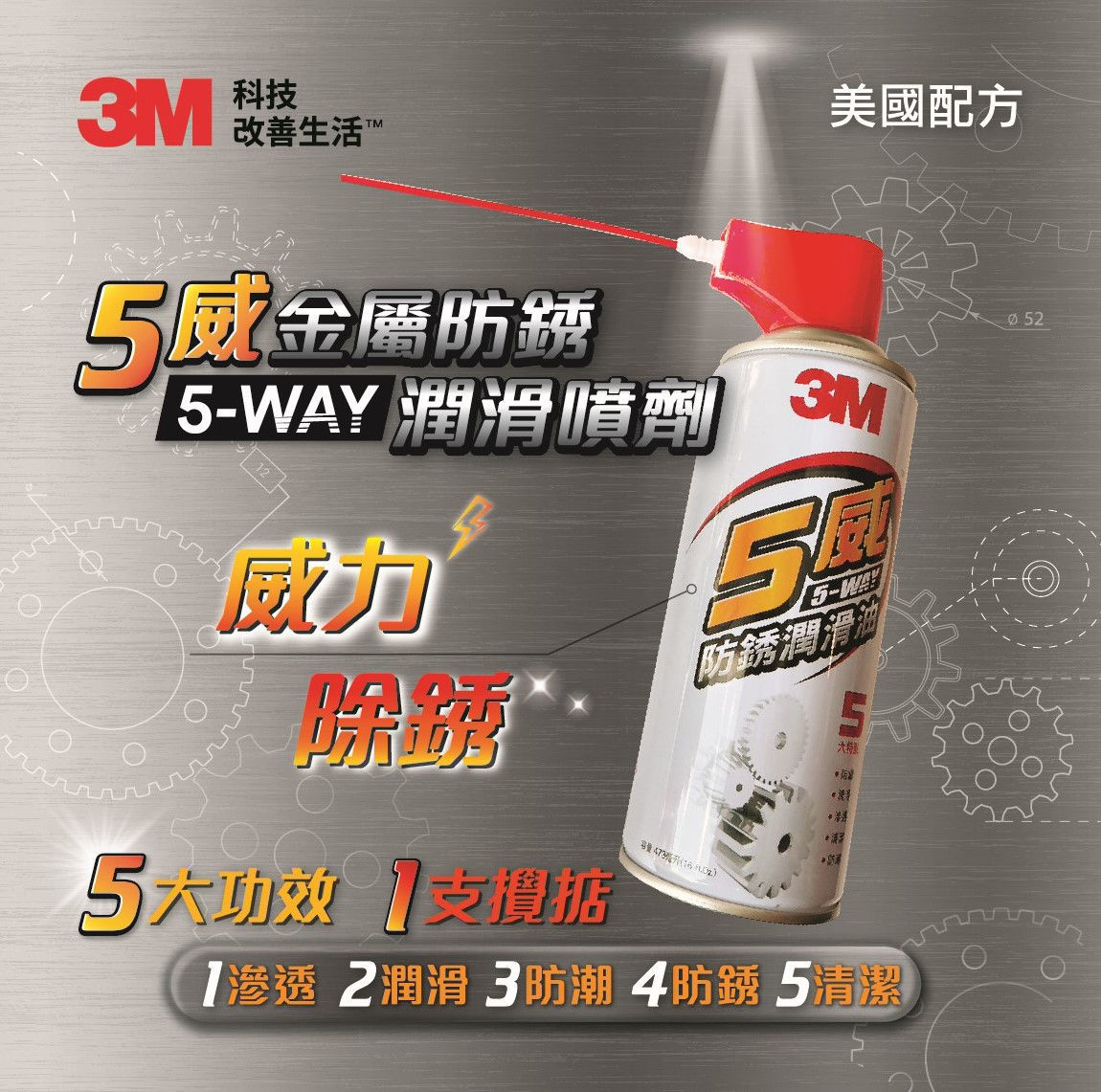 3M™ 五威除鏽劑可破壞阻礙普通零件移動的鏽蝕,如生鏽的曲柄、槓桿和把手,以及卡住的螺母和螺栓。 由3M設計的此種多用途、不含矽化學品可均勻噴塗,形成一層均勻薄膜,即使是堅硬無比的障礙物也可滲透。