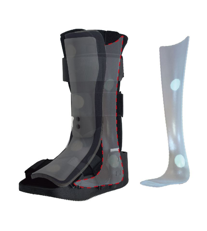 - 兩側鋁條及前後成型膠板固定足踝及小腿