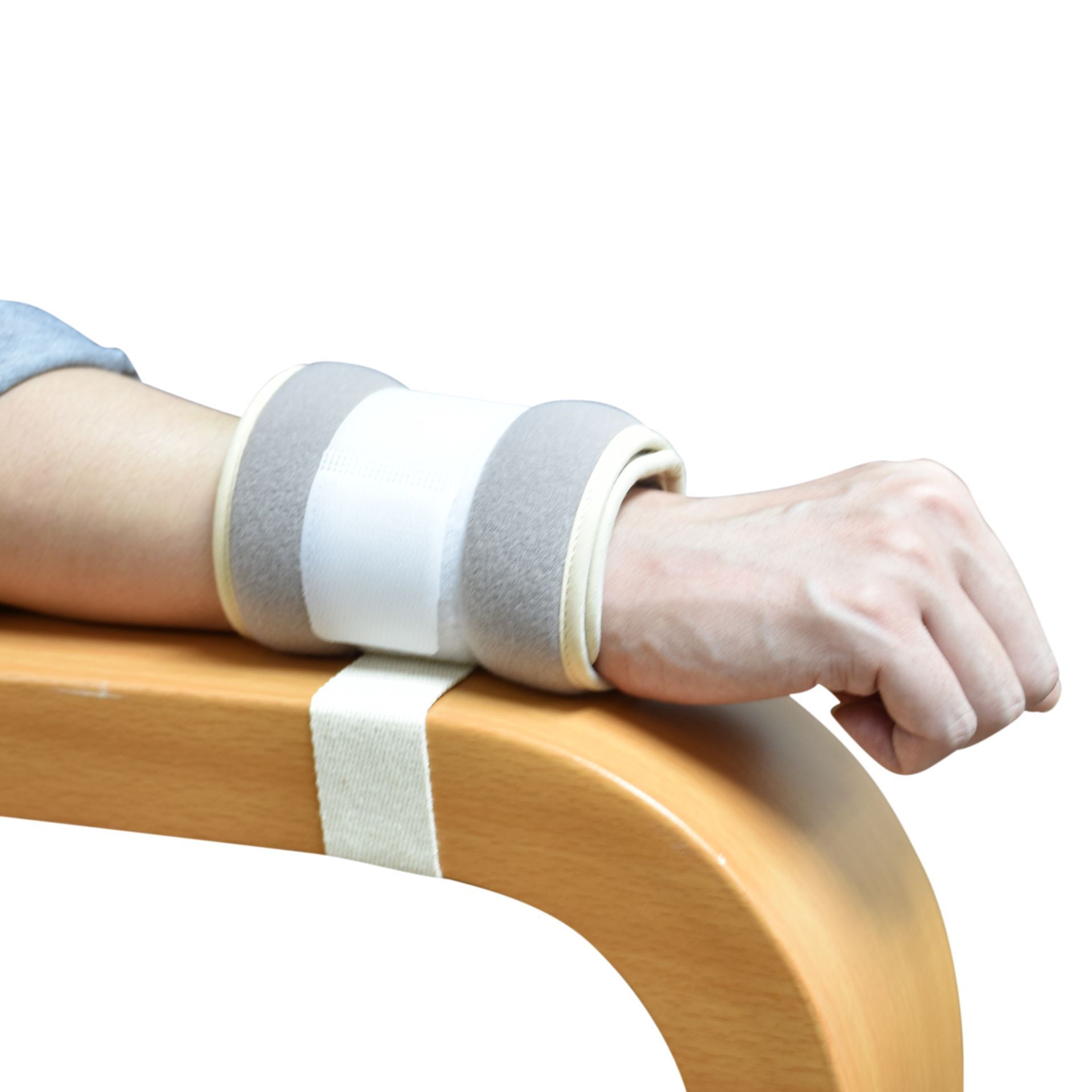 - 海綿夾心綿質粘貼面料附有粘帶及綁帶可固定上下肢在床,手柄椅及輪椅上