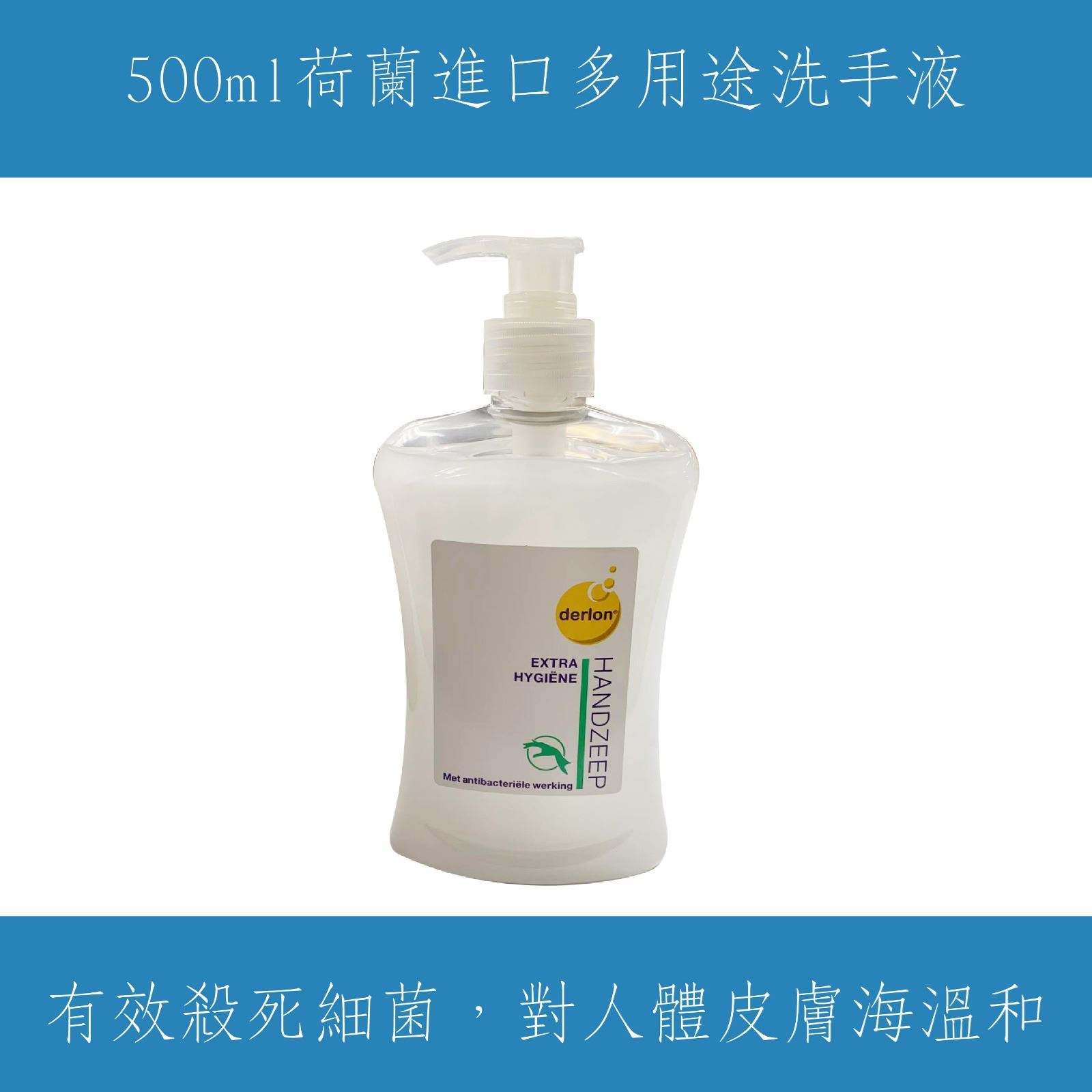 500ml荷蘭進口Derlon Extra Hygiene多用途洗手液。可以有效殺死細菌和有效殺滅多種不同病毒,對人體皮膚海溫和